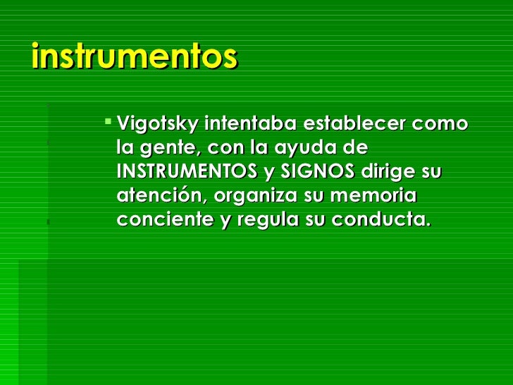 - Vigotsky intentaba establecer como la gente, con la ayuda de INSTRUMENTOS y SIGNOS dirige su atención, organiza su memoria conciente y regula su conducta.