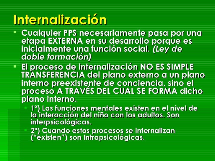 - El proceso de internalización NO ES SIMPLE TRANSFERENCIA del plano externo a un plano interno preexistente de conciencia, sino el proceso A TRAVÉS DEL CUAL SE FORMA dicho plano interno.