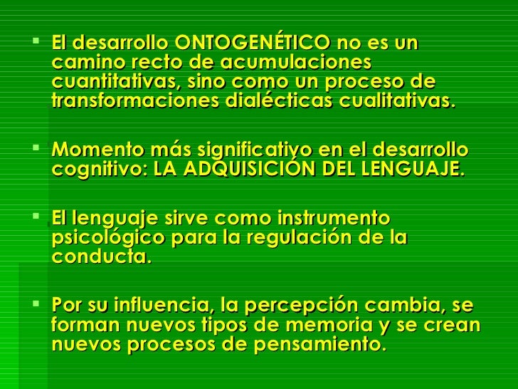 - El desarrollo ONTOGENÉTICO no es un camino recto de acumulaciones cuantitativas, sino como un proceso de transformaciones dialécticas cualitativas.