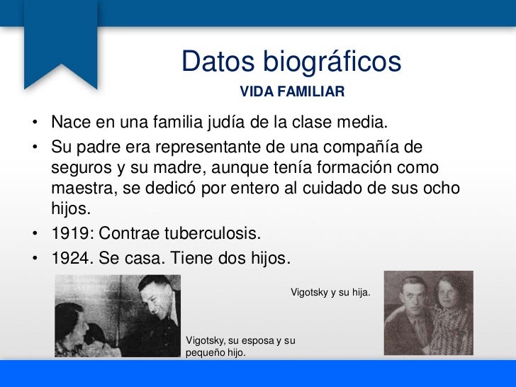 - 6. Datos biográficos VIDA FAMILIAR• Nace en una familia judía de la clase media.• Su padre era representante de una compañía de seguros y su madre, aunque tenía formación como maestra, se dedicó por entero al cuidado de sus ocho hijos.• 1919: Contrae tuberculosis.• 1924. Se casa. Tiene dos hijos. Vigotsky y su hija. Vigotsky, su esposa y su pequeño hijo.